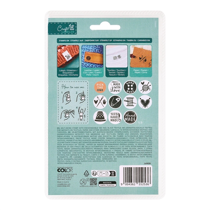 Forside » TILBEHØR » DIVERSE TILBEHØR Begrænset lager Lev. 1-2 hverdage Bedømmelse for Craft Labeler Stempelsæt, rundtProduktet er endnu ikke bedømt Pris ved køb af 1 Pakke,140,00 DKK Antal CRAFT LABELER STEMPELSÆT, RUNDT INDEHOLDER 1 stempel med sort stempelblæk 10 udskiftelige "Handmade" piktogrammer 1 pincet. STØRRELSE: Diameter, stempel: ca. 1,8 cm Højde: ca. 6,5 cm Med dette stempel kan du sætte dit personlige præg på dit håndarbejde. Brug stemplet direkte i tøjet eller på en label, der derefter sys i tøjet. Kan bl.a. bruges på tekstiler, læder, papir, træ og andre absorberende overflader. Blækket tåler at blive vasket ved op til 90°C. Made in Austria Varenr.: 9892-0000 Relaterede produkter Craft Labeler Stempelsæt DKK 240,00 Craft Labeler, Læder Labels DKK 80,00